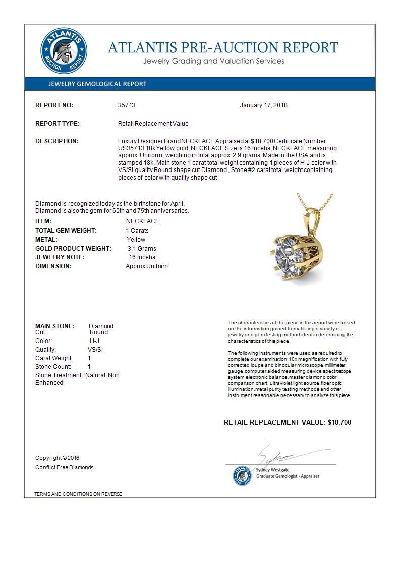 REF-280W2F -35713 ---- 1 CTW VS/SI Diamond Solitaire Necklace 18K Yellow Gold ---- Luxury Designer Brand NECKLACE Appraised at $18,700 Certificate Number US35713 18k Yellow gold, NECKLACE Size is 16 Incehs, NECKLACE measuring approx. Uniform, weighing in total approx. 2.9 grams. Made in the USA and is stamped 18k, Main stone 1 carat total weight containing 1 pieces of H-J color with VS/SI quality Round shape cut Diamond , Stone #2 carat total weight containing pieces of color with quality shape cut