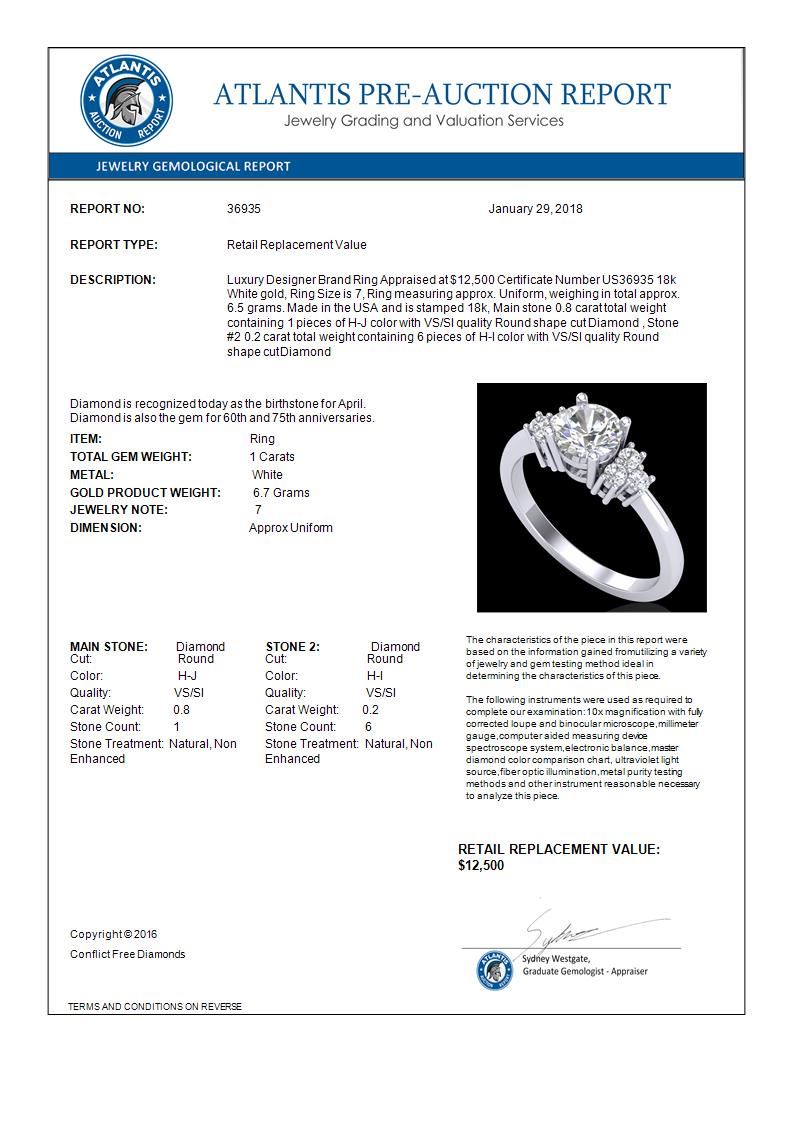 REF-227H3A -36935 ---- 1 CTW VS/SI Diamond Solitaire Ring 18K White Gold ---- Luxury Designer Brand Ring Appraised at $12,500 Certificate Number US36935 18k White gold, Ring Size is 7, Ring measuring approx. Uniform, weighing in total approx. 6.5 grams. Made in the USA and is stamped 18k, Main stone 0.8 carat total weight containing 1 pieces of H-J color with VS/SI quality Round shape cut Diamond , Stone #2 0.2 carat total weight containing 6 pieces of H-I color with VS/SI quality Round shape cut Diamond