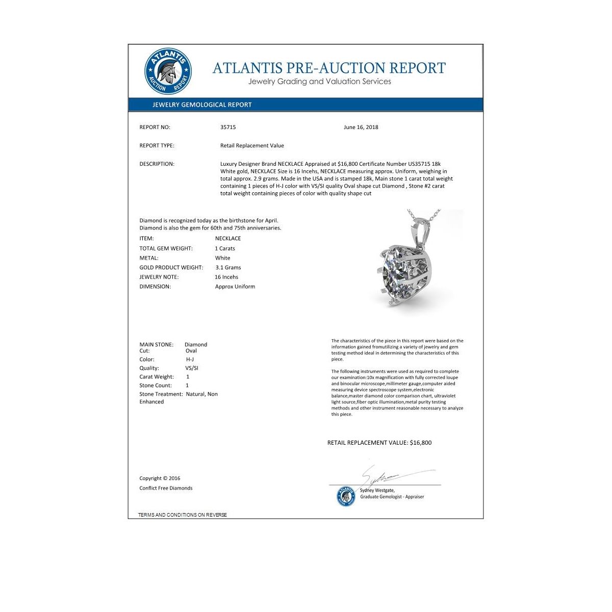 REF-280Y2K -35715 ---- 1 CTW VS/SI Oval Diamond Solitaire Necklace 18K White Gold ---- Luxury Designer Brand NECKLACE Appraised at $16,800 Certificate Number US35715 18k White gold, NECKLACE Size is 16 Incehs, NECKLACE measuring approx. Uniform, weighing in total approx. 2.9 grams. Made in the USA and is stamped 18k, Main stone 1 carat total weight containing 1 pieces of H-J color with VS/SI quality Oval shape cut Diamond , Stone #2 carat total weight containing pieces of color with quality shape cut