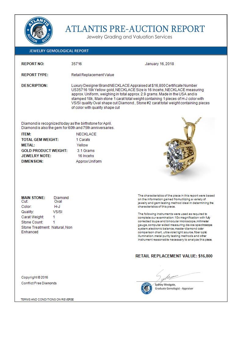 REF-280A2X -35716 ---- 1 CTW VS/SI Oval Diamond Solitaire Necklace 18K Yellow Gold ---- Luxury Designer Brand NECKLACE Appraised at $16,800 Certificate Number US35716 18k Yellow gold, NECKLACE Size is 16 Incehs, NECKLACE measuring approx. Uniform, weighing in total approx. 2.9 grams. Made in the USA and is stamped 18k, Main stone 1 carat total weight containing 1 pieces of H-J color with VS/SI quality Oval shape cut Diamond , Stone #2 carat total weight containing pieces of color with quality shape cut