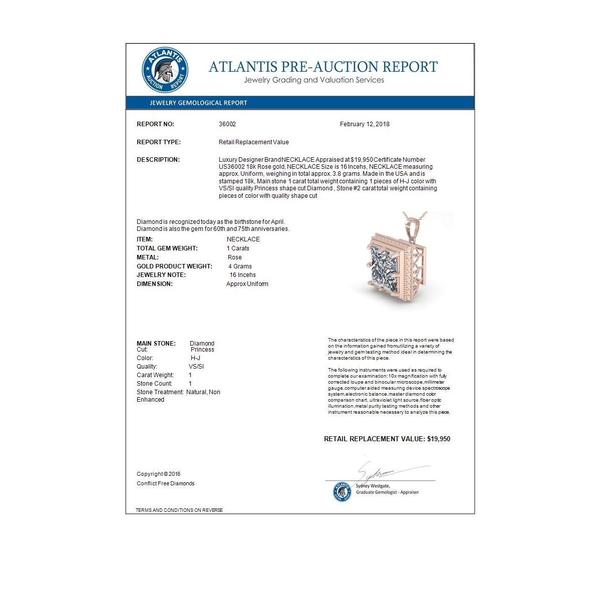 REF-332K8W -36002 ---- 1 CTW VS/SI Princess Diamond Solitaire Necklace 18K Rose Gold ---- Luxury Designer Brand NECKLACE Appraised at $19,950 Certificate Number US36002 18k Rose gold, NECKLACE Size is 16 Incehs, NECKLACE measuring approx. Uniform, weighing in total approx. 3.8 grams. Made in the USA and is stamped 18k, Main stone 1 carat total weight containing 1 pieces of H-J color with VS/SI quality Princess shape cut Diamond , Stone #2 carat total weight containing pieces of color with quality shape cut