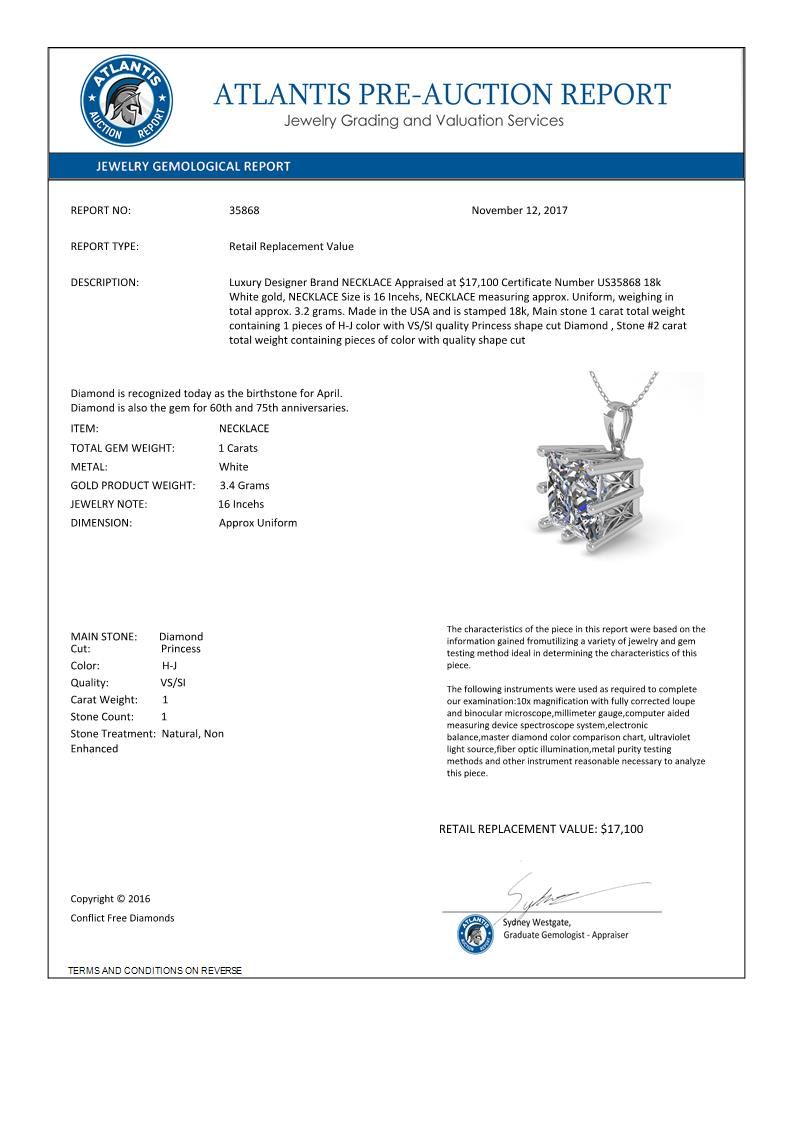 35868 - REF-285A2V ---- 1 CTW VS/SI Princess Diamond Solitaire Necklace 18K White Gold ---- Luxury Designer Brand NECKLACE Appraised at $17,100 Certificate Number US35868 18k White gold, NECKLACE Size is 16 Incehs, NECKLACE measuring approx. Uniform, weighing in total approx. 3.2 grams. Made in the USA and is stamped 18k, Main stone 1 carat total weight containing 1 pieces of H-J color with VS/SI quality Princess shape cut Diamond , Stone #2 carat total weight containing pieces of color with quality shape cut