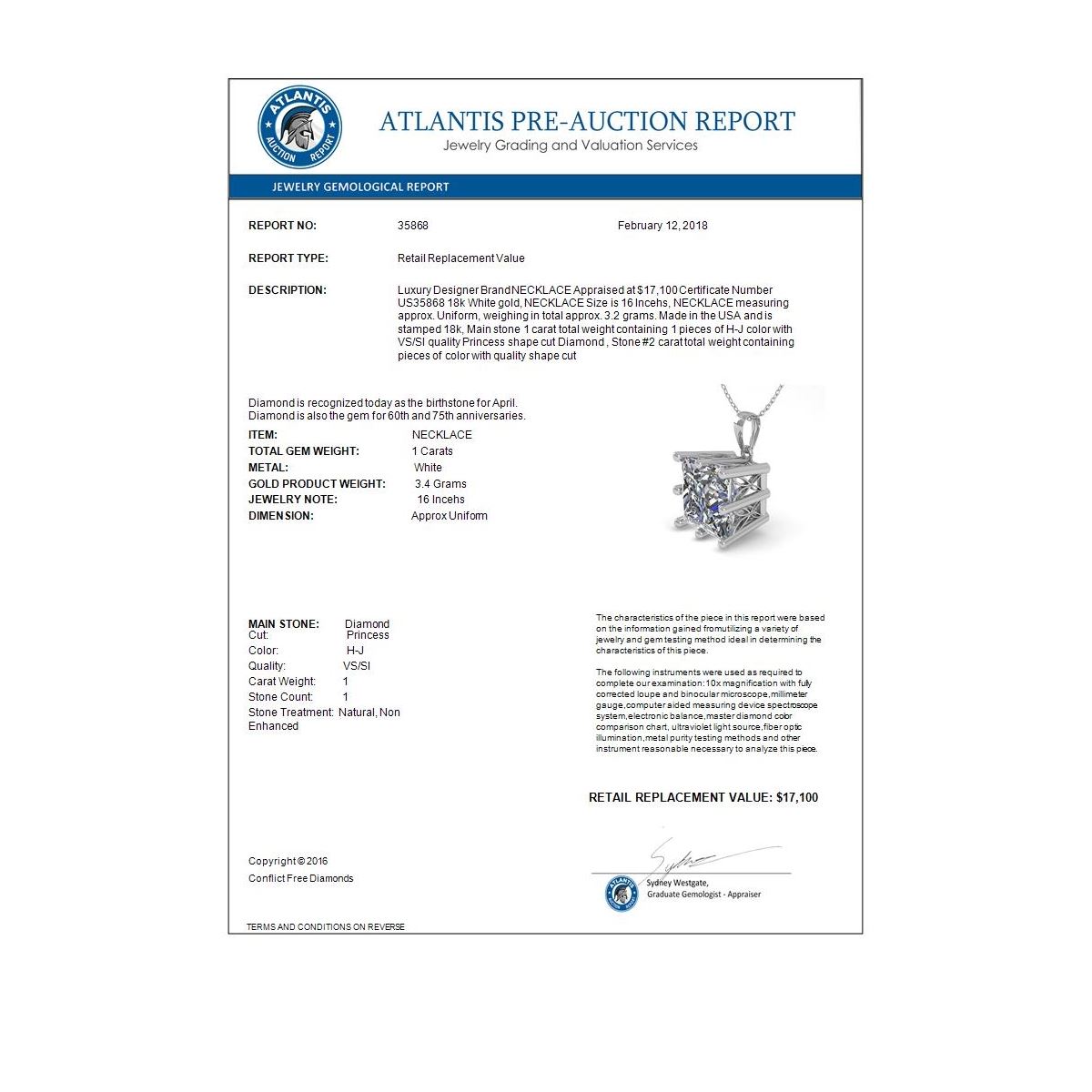 REF-285Y2K -35868 ---- 1 CTW VS/SI Princess Diamond Solitaire Necklace 18K White Gold ---- Luxury Designer Brand NECKLACE Appraised at $17,100 Certificate Number US35868 18k White gold, NECKLACE Size is 16 Incehs, NECKLACE measuring approx. Uniform, weighing in total approx. 3.2 grams. Made in the USA and is stamped 18k, Main stone 1 carat total weight containing 1 pieces of H-J color with VS/SI quality Princess shape cut Diamond , Stone #2 carat total weight containing pieces of color with quality shape cut