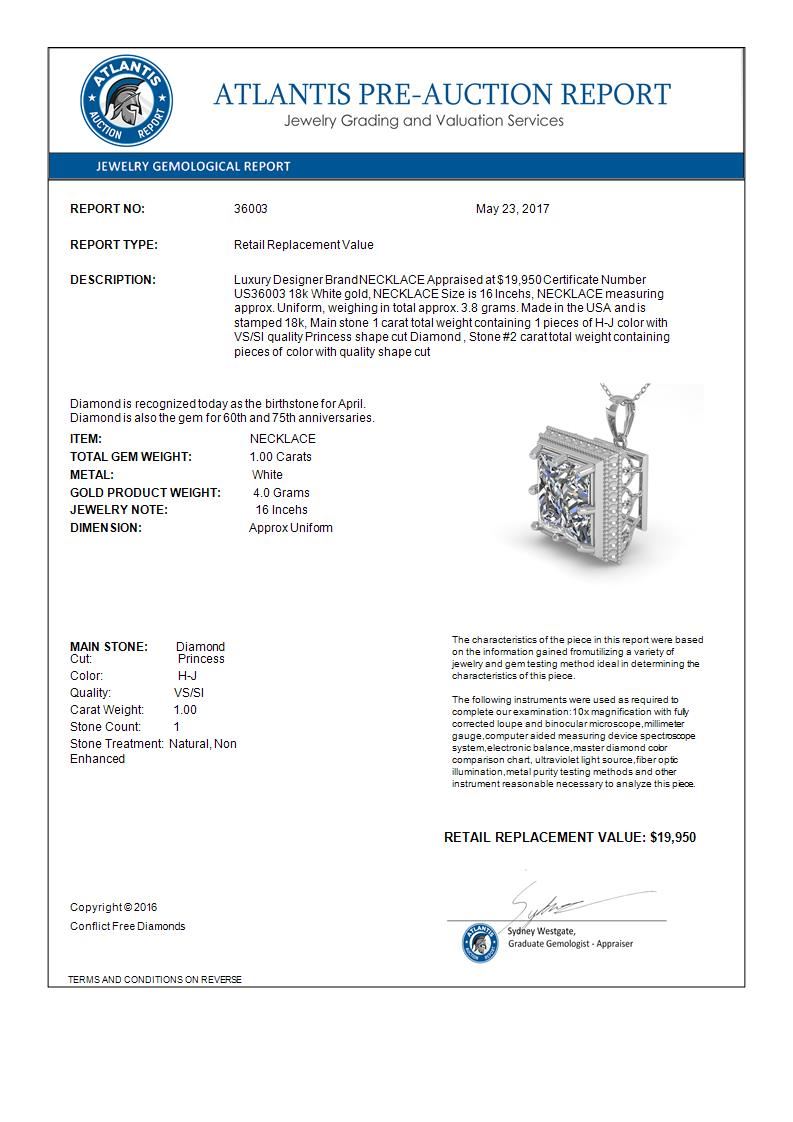 1 CTW VS/SI Princess Diamond Solitaire Necklace 18K White Gold ---- Luxury Designer Brand NECKLACE Appraised Retail Price at $19,950 ---- SKU Number US36003 18k White gold NECKLACE Size is 16 Incehs, NECKLACE measuring approx. Uniform, weighing in total approx. 3.8 grams. Made in the USA and is stamped 18k, Main stone 1.00 carat total weight containing 1 pieces of H-J color with VS/SI quality Princess shape cut Diamond , Stone #2 carat total weight containing pieces of color with quality shape cut