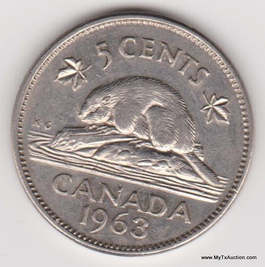 1-1963 5 Cent - Elizabeth II (1st portrait) Country:Canada - Coin Mint Years:1963-1964 - Metal:Nickel - Weight:4.54g - Diameter:21.21mm - Thickness:1.70mm - Design Obverse:The portrait in right profile of Elizabeth II, when she was 27 years old, is surrounded with the inscription "ELIZABETH II DEI GRATIA REGINA" (Elizabeth II, Queen by the grace of God) Lettering: ELIZABETH II DEI GRATIA REGINA - Reverse:A beaver, over the inscription "CANADA", is surrounded with the facial value, flanked on both sides by a maple leaf. This coin uses the same small beaver than KM# 50a, adjusted to the round frame. Lettering:5 CENTS CANADA 1963 - Engravers:Mary Gillick (obverse) George Edward Kruger Gray (reverse) - Shape:Round - Edge:Smooth