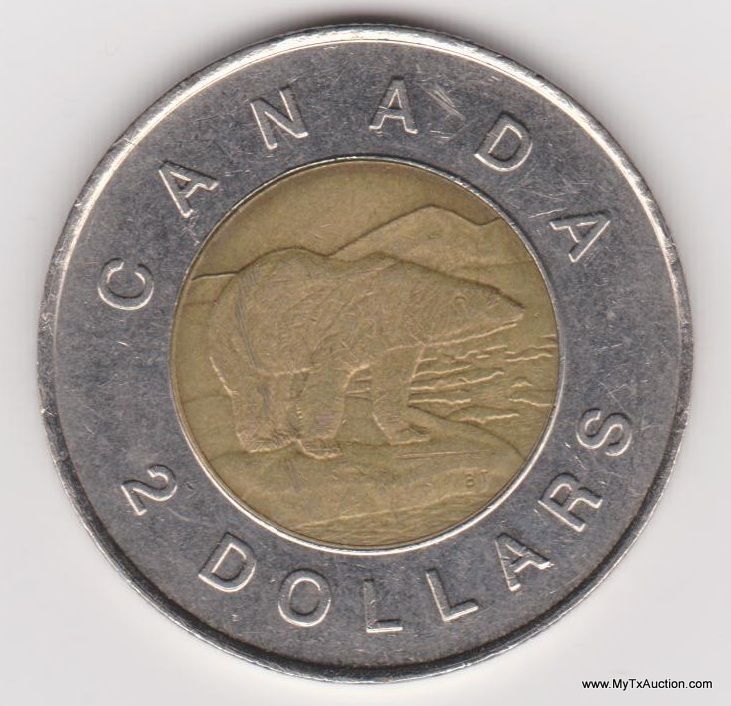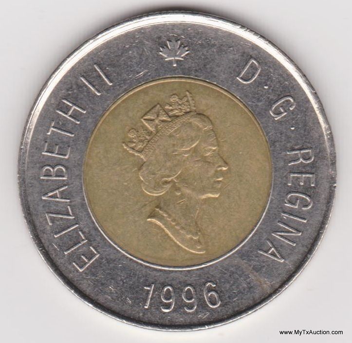 1-1996 2 Dollars - Elizabeth II (3rd portrait) Country:Canada - Coin Mint Years:1996-2003 - Metal:Bi-Metallic Aluminium-bronze center in Nickel ring - Weight:7.3g - Diameter:28mm - Thickness:1.8mm - Design Obverse:The portrait in right profile of Elizabeth II, when she was 64 years old, is surrounded with the inscription "ELIZABETH II D • G • REGINA" (Elizabeth II, Queen by the grace of God) Lettering:ELIZABETH II D·G·REGINA 1996 - Reverse:A polar bear along the edge of an ice floe is surrounded with the facial value and the inscription "CANADA" Lettering:CANADA 2 DOLLARS - Engravers: Shape:Round - Edge:Segmented reeding