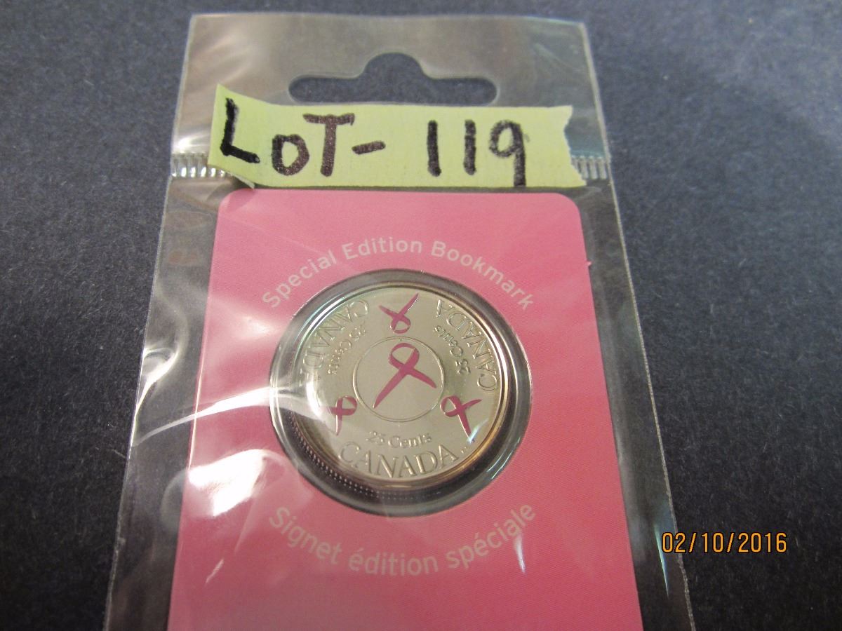 1 Canadian Special Edition Bookmark 25 cent Breast Cancer Pink quarter and pin set. Uncirculated in sealed package