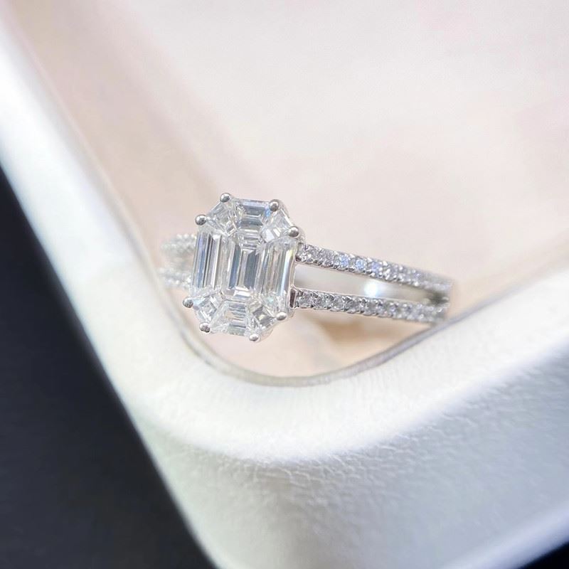 A 1-carat emerald-cut diamond sparkles at the center, framed by a double-row pavé band. Its clean geometry and radiant brilliance embody timeless elegance and understated luxury.Ring size: 6, circumference: 52 mm, diameter: 16.6 mm, main diamond: 0.450ct, side diamonds: 0.162 ct. Note: Comes with an AGL certificate and a domestic jewelry identification certificate.