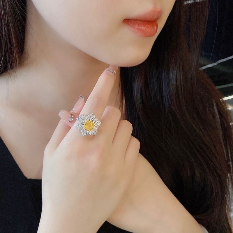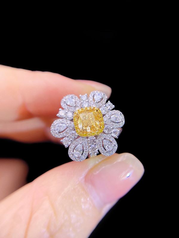 This 1-carat floral diamond ring is inspired by the beauty of blooming flowers. A brilliant yellow diamond sits at the center, surrounded by layers of sparkling white diamonds that form a radiant blossom. The warm hue of the yellow diamond contrasts elegantly with the pure brilliance of the white stones, creating a luxurious and feminine look. Exquisitely crafted, this ring exudes grace, charm, and timeless elegance.Ring size: 6, circumference: 52 mm, diameter: 16.6 mm, main diamond: 1.04 ct, side diamonds: 1.479 ct.