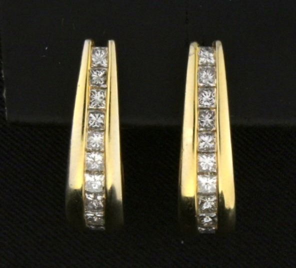 In 14k Yellow Gold. Contains 20 high quality princess cut diamonds, SI clarity, H Color, 1 ct TW. 3/4 inches long. With friction backs. 5.8g