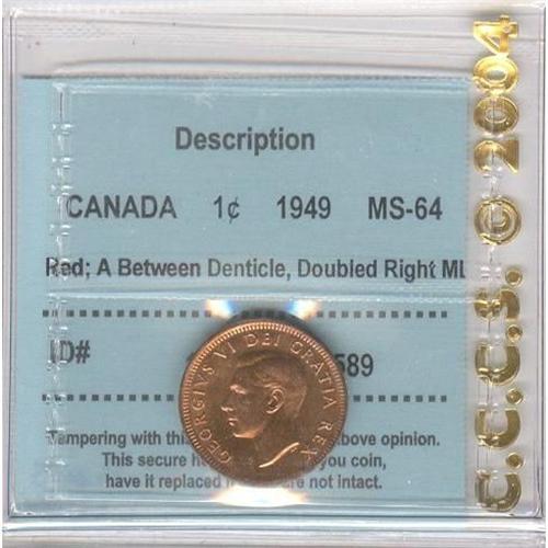 1 Cent 1949, graded CCCS MS-64; Red, A Between Denticle, Doubled Right Maple Leaf. Nice problem free red cent.