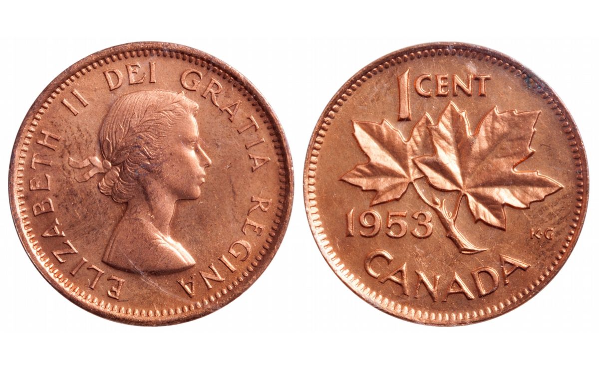 1 Cent. 1953. Shoulder fold. ICCS graded Gem Uncirculated-65 Red. Only 1 coin graded finer by ICCS in MS-66.