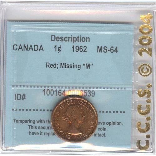 1 Cent 1962, graded CCCS MS-64; Red, Missing M. The initial M is missing at the base of the Bust of the Queen.