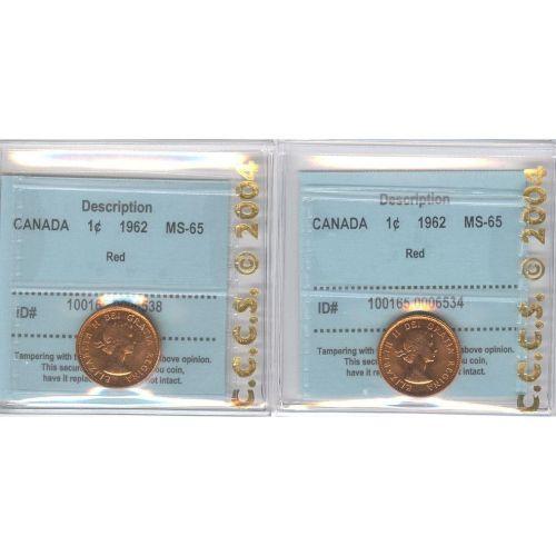 1 Cent 1962, graded CCCS MS-65; Red. Gem red cent. Lot of 2 coins