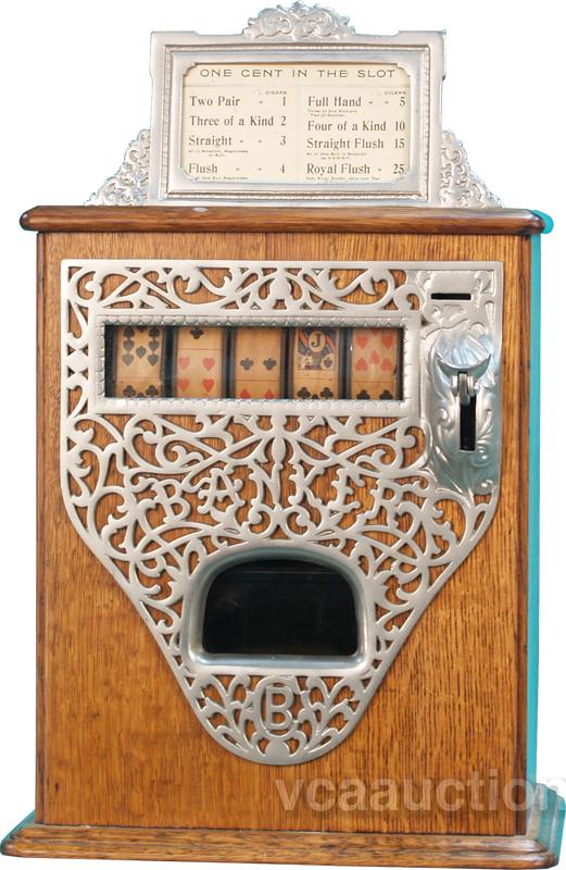 1 Cent Caille "Banker" Wooden 5 Reel Trade Stimulator c.1906 Reel strips show playing cards. w/key