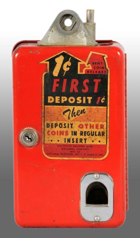 Description This machine was attached to coke machines. When the price of coke went up to 6-cent, you would pay a penny here then a 5-cents to the coke machine. Label on front with some soiling. Some scratching. Nice condition overall. No key present. Condition (Excellent). Size 10 - 1/2" x 5 - 1/2" x 2 - 1/4".