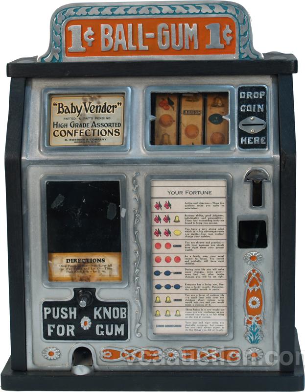 1 Cent Countertop "Baby Vender" 3-Reel Ball Gum Trade Stimulator by Burnham & Mills c1927 w/ keys