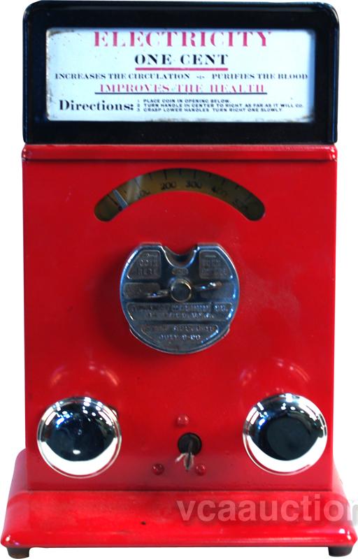1 Cent Countertop "Electricity" Shock Machine by Advance Machine Co. Chicago, USA. c1940's "Increases The Circulation - Purifies The Blood" works w/ battery w/ keys
