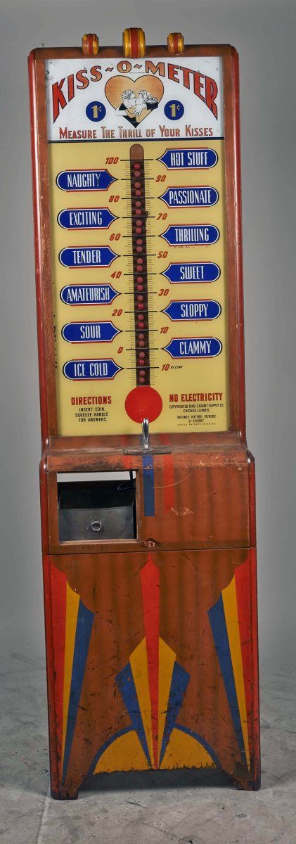 In painted wood cabinet. Circa 1940. By Exhibit Supply Co. Pat. 1917385 -1976082 D-120997. Has cash box but missing back door and coin entry, nice back glass with very minimal wear. Condition (Good). Size 22" x 16/5" x 78".
