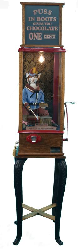1 Cent Floor Model "Puss In Boots" Chocolate Vending Arcade Machine (by Gorski) w/ keys