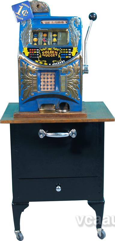 1 Cent Mills Atkins Front New Blue "Golden Nugget" Slot Machine c1955 w/ stand w/ keys