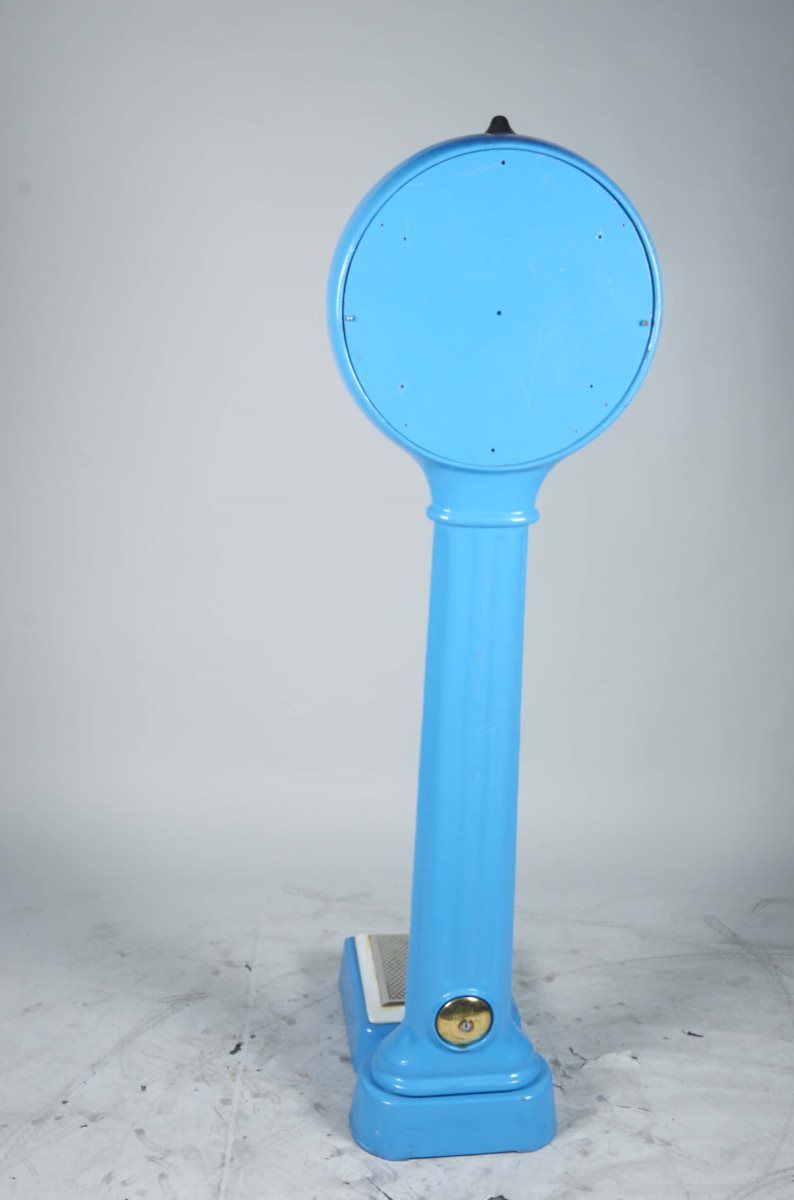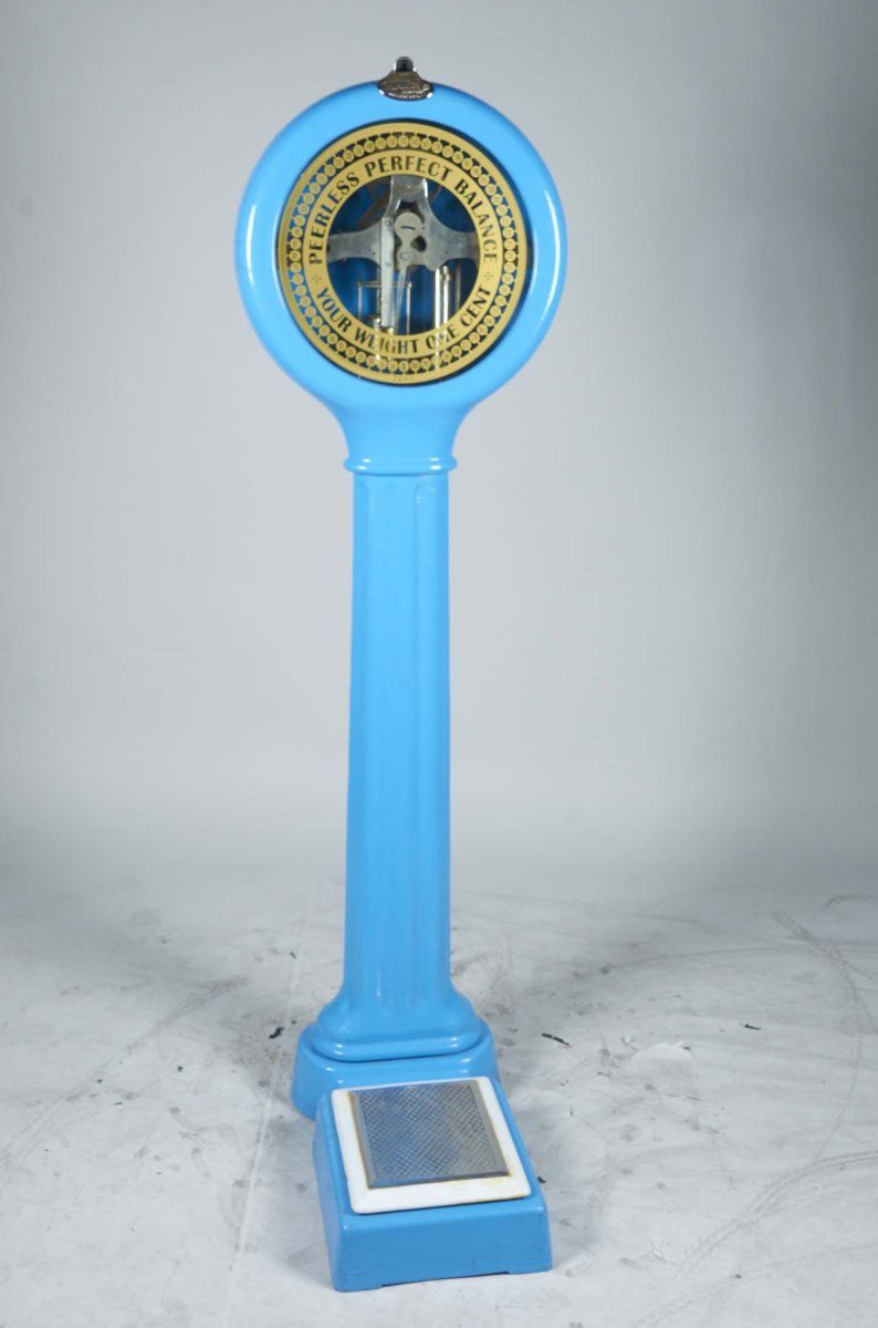Turquoise porcelain base with "Peerless Perfect Balance - Your Weight One Cent" reverse on glass dial. Condition (Very good). Size 68" T.