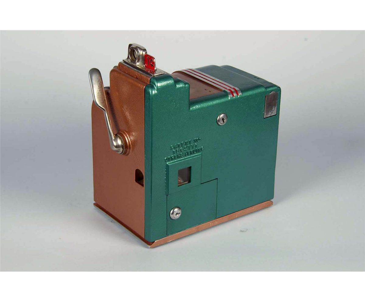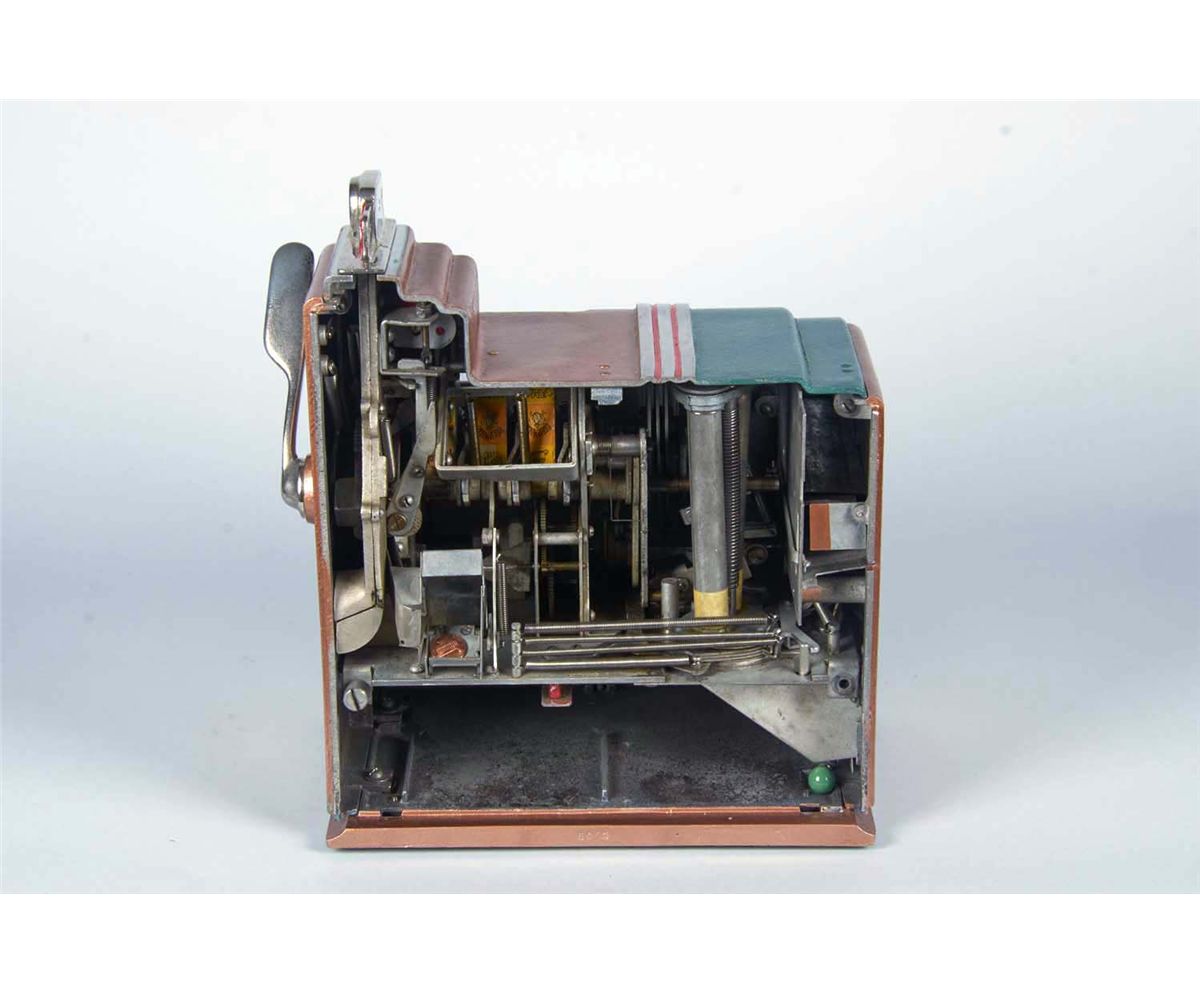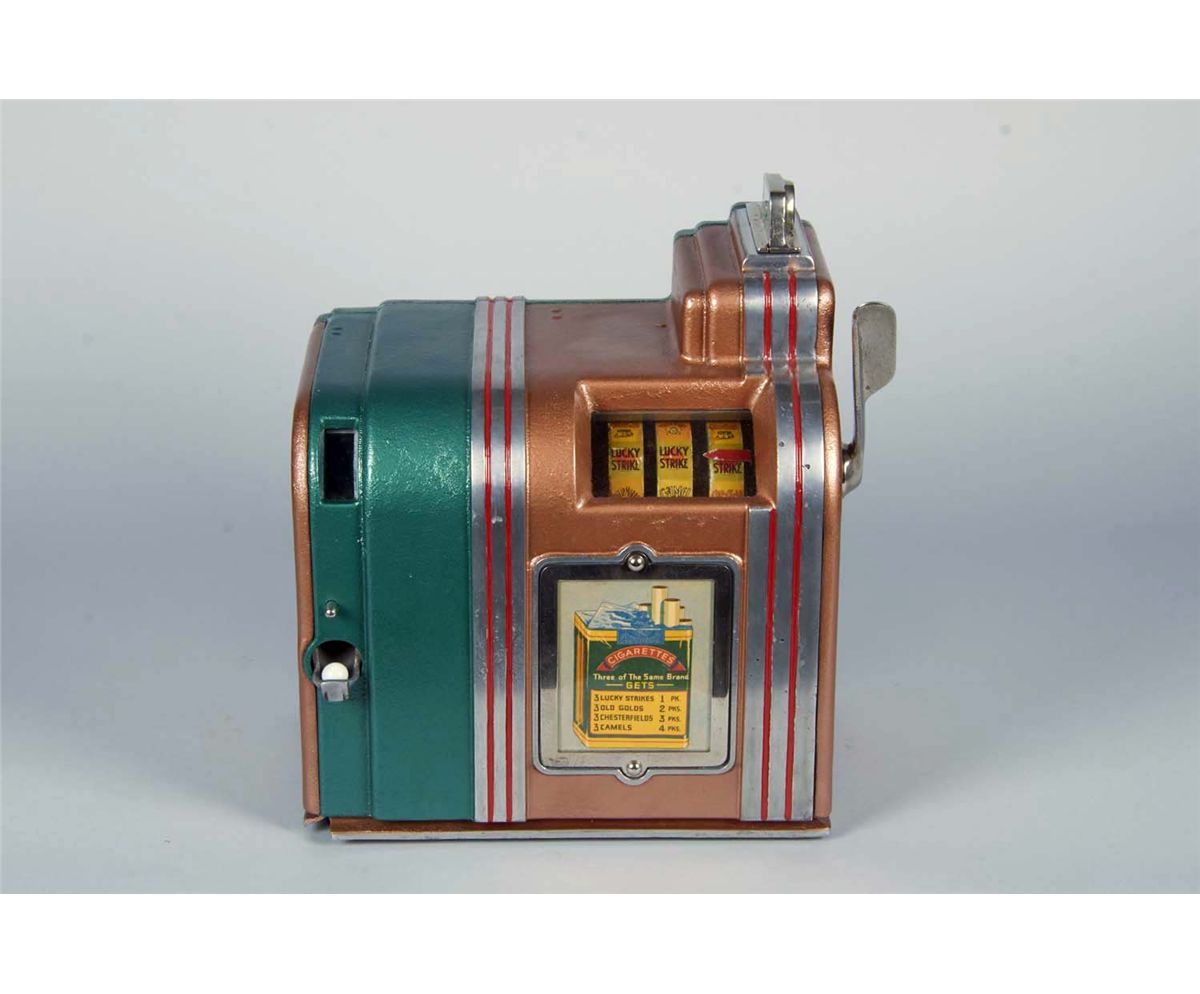 3-Reel countertop token payout cigarette trade stimulator with gumball vendor circa 1938. Machine has Lucky Strike reels and cigarette award card. Restored with keys. Condition (Very good). Size 11" x 7" x 13"