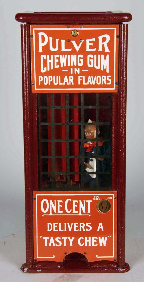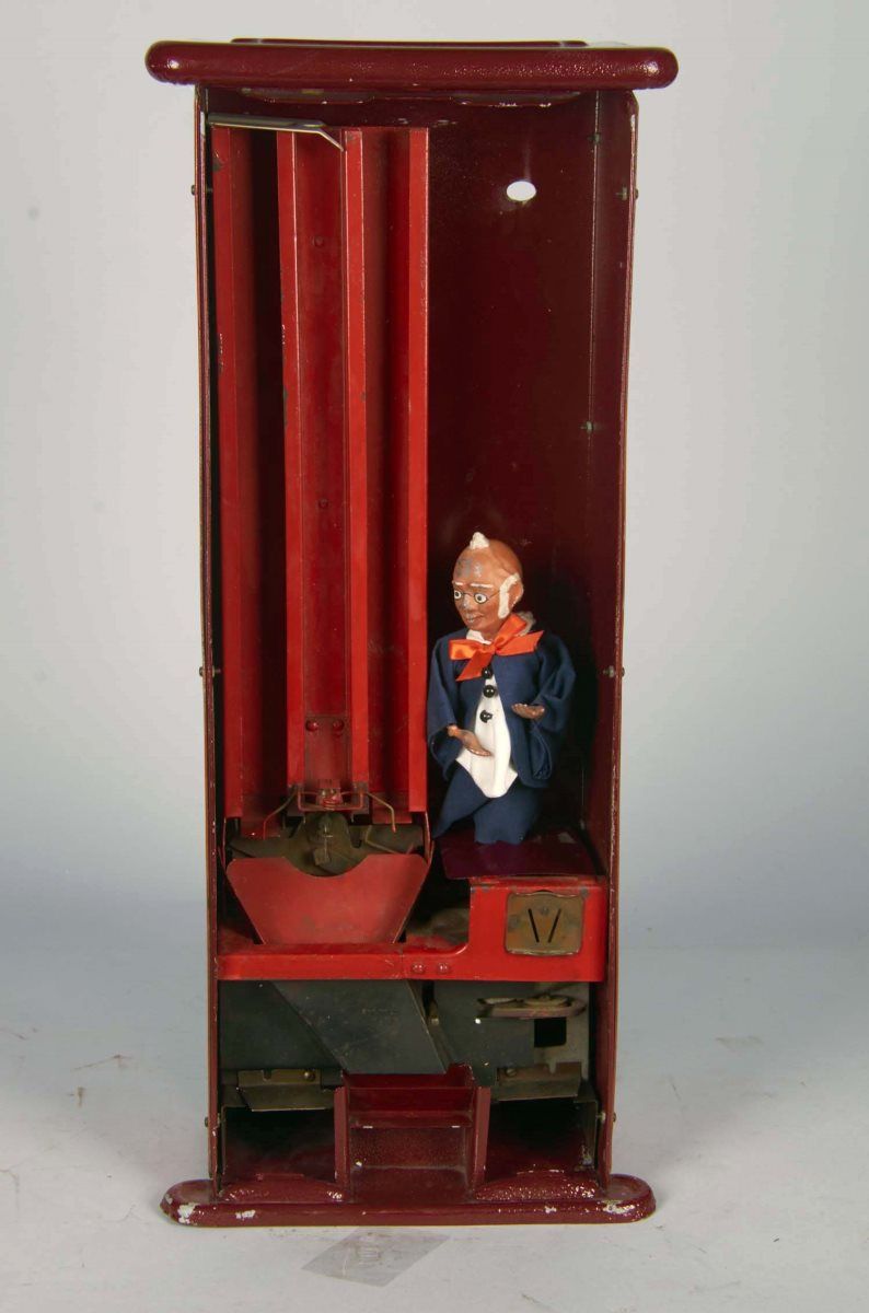 Tall case "Delivers A Tasty Chew" gum vendor w/ "Foxy Grandpa" AKA The Professor character figure (original but clothes may be reproduction), Balto. Enamel & Nov. Co. c1915 w/ key Condition (Very good). Size 10-1/2" x 6" x 24"