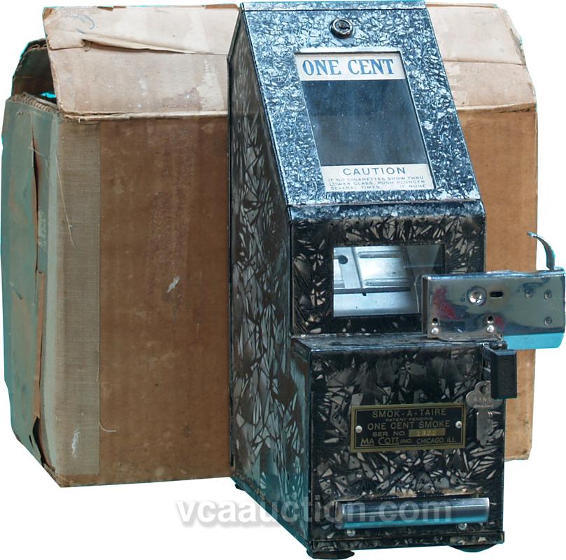 1 Cent Smok-A-Taire Cigarette Vending Machine Very unique size and shape. Mint condition N.O.S in original box w/keys Mfg. by MA Cott Inc. Chicago IL