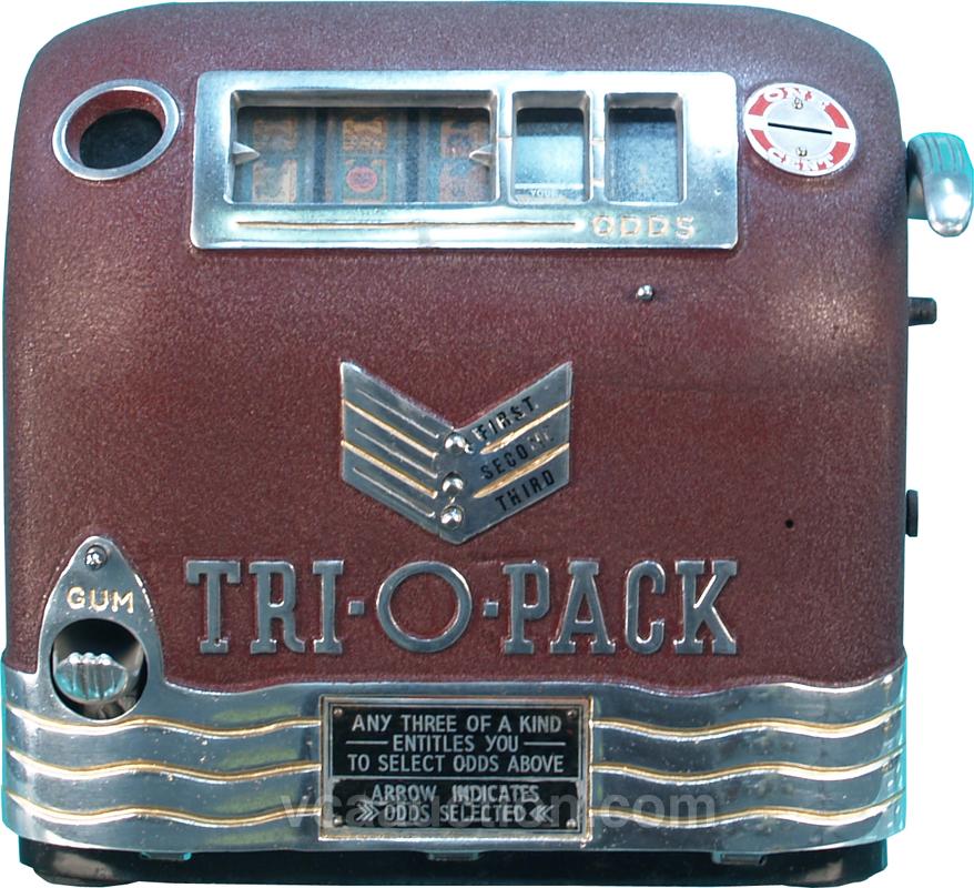 1 Cent Tri-O-Pack Cigarette 3-Reel Trade Stimulator w/ "Odds" Selection c1930's, rare machine, in excellent condition w/ keys