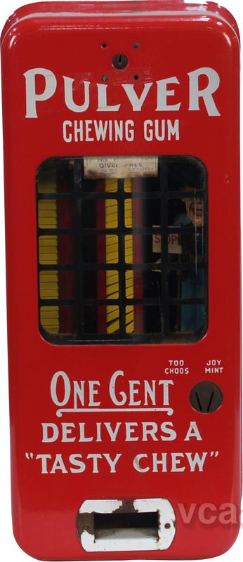 1 Cent Wall Mount Red Porcelain "Short Case" Pulver Chewing Gum Vending Machine w/ cop directing traffic figure inside w/ keys