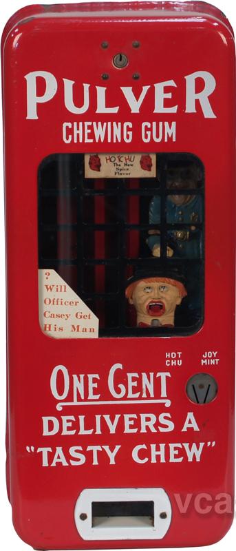 1 Cent Wall Mount Red Porcelain "Short Case" Pulver Chewing Gum Vending Machine w/ cop & robber figure inside w/ key & wind-up key