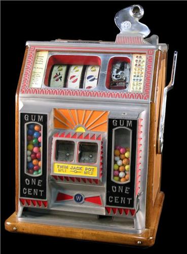 1 Cent Watling Slot Machine Twin Jackpots Twin Gum Ball Vendors <BR>Due to laws regulating the sale of antique slot machines, I, as the seller, will not sell to from members in the states of Alabama, Connecticut, Hawaii, Indiana, Nebraska, South Carolina, and Tennessee. Bids from members residing in any of these states will be cancelled.