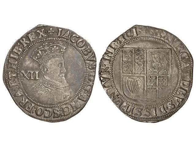 1 Chelín. (1604-1605). JAIME I. Anv.: IACOBVS:D:G:ANG:SCO:FRA:ET:HIB:REX. Busto a derecha. Rev.: EXVRGAT:DEVS:DISSIPENTVR:INIMICI. Escudo cuartelado. AR. Pátina. (Acuñación floja). Spink-2646. (MBC+).