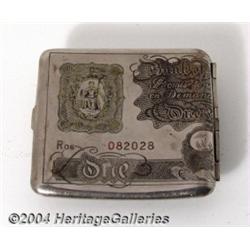 1 $ Cigarette Case. A half-size case portraying a British $1 note. Although the color is mostly gone, traces of green and red remain. Well-used but with its clasp and spring in working order. The internal ribbon is present. <BR><BR><B>Important notice:</B> Heritage usually auctions material at the rate of 200-250 lots per hour. On some occasions eBay Live bid software or the Internet may not be able to keep up with the pace of the auction. We recommend placing a realistic absentee bid now as insurance to avoid disappointment. Occasionally the auctioneer may eliminate or reject an eBay Live bid, and the auctioneer may also reopen a lot after the close of the eBay live bidding (usually because we missed an audience bid), and may reject your bid even if it shows you as the winning bidder. By bidding via eBay Live, you agree that Heritage may award the lot to another bidder at its sole discretion under the circumstances described above or any other reasonable circumstances. Since eBay bids are not shown to us until we open the lot on the floor, we treat those bids just like floor bids. In most cases the floor responds before the eBay bid is presented to us, due to Internet lag time, so for consistency we have made it a policy that floor bids are always considered first over tie eBay live bids. Also please note that all Heritage lots purchased through eBay Live carry a 20% Buyer's Premium. Please make sure you read the Terms and Conditions before you bid. <BR><BR><B>IMPORTANT ANNOUNCEMENT ABOUT RESERVES:</B> Heritage now divulges all reserves on its web site 7 days before every auction. If you want to know whether the reserve on this lot has been met, and if not, what the reserve amount is, please visit this lot page on the HeritageCoin.com web site, or email: bid@HeritageGalleries.com