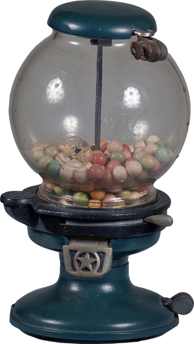 Circa 1910. Green cast iron base. Glass globe with barrel locks and key. Not presently working. Condition (Very Good). Size 14-1/2" x 7-1/2".
