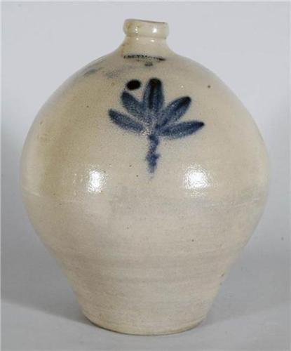 1 DECORATED 3 GALLON STONEWARE JUG, with leaf decoration, stamped "L. Seymour, Troy", CONDITION: 1" bruise and spider crack, PACKING AND SHIPPING (excluding insurance) AVAILABLE WITHIN CONTINENTAL U.S. BY FAIRFIELD AUCTION FOR $60 . BUYER MAY ALSO PICK-UP OR USE A 3RD PARTY FOR PACKING AND SHIPPING