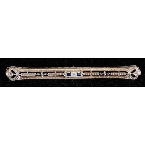 1 DIAMOND AND SAPPHIRE BAR PIN<BR>set in 14k white gold<BR>CONDITION REPORT: excellent<BR>PACKING AND SHIPPING (excluding insurance) by Fairfield Auction to points within the Continental U.S.A. (all other international must be handled by 3rd party shipper) $20.
