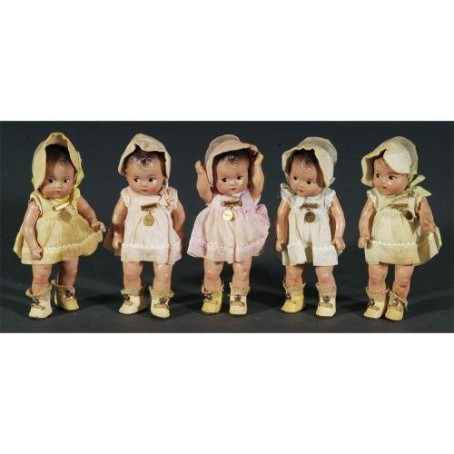 1 DIONNE QUINTUPLET DOLLS<BR>7 1/2" high composition<BR>circa 1936<BR>CONDITION REPORT: somewhat dirty with stains.<BR>PACKING AND SHIPPING (excluding insurance) by Fairfield Auction to points within the Continental U.S.A. (all other international must be handled by 3rd party shipper) $30.