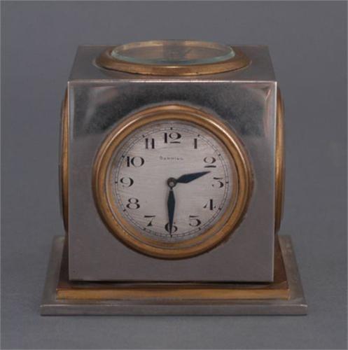 1 DUNHILL WEATHER STATION CLOCK with thermometer, barometer, perpetual calendar and compass marked "Alfred Dunhill, London, New York" "made in France", 3" high early 20th century, packing and shipping $20