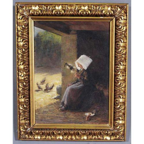 1 DUTCH SCHOOL<BR>Flax Spinning in the Barn<BR>18"x 13" oil on canvas<BR>signed "A. Roszimunn??" lower right<BR>CONDITION REPORT: excellent with one surface scratch above bonnet.<BR>PACKING AND SHIPPING -see recommended.