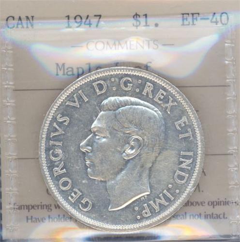 1 Dollar 1947, ICCS certified EF-40; Maple Leaf, PQ. Big demand at this time for this variety.