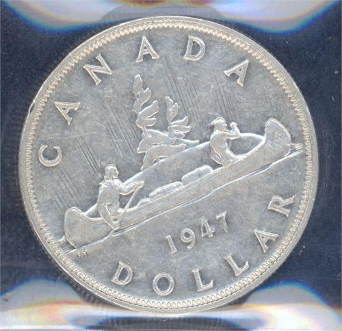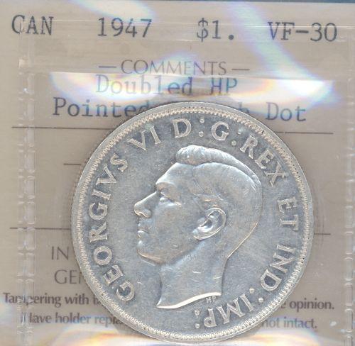 1 Dollar 1947, ICCS certified VF-30; Doubled HP, Pointed 7 with dot. Possibly the hardest variety to find.