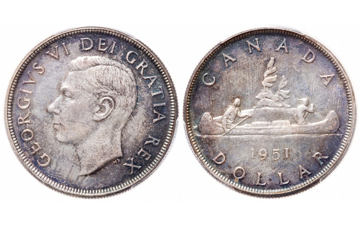 1951. Arnprior. PCGS graded Superb Gem Uncirculated-66. A marvellous patina of silvery-white toning blankets the immaculate surfaces of this outstanding coin, with pastel hues of violet and gunmetal blue deepening around the perimeters. The sharply struck details clearly reveal the incomplete waterlines at the bow of the canoe that denote this scarce variety. The Solo Finest graded by PCGS and an unrivalled condition rarity to grace a superb dollar collection.