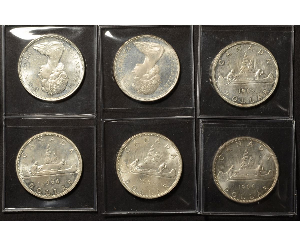 1 Dollar 1963 MS-62, 1965 LB PT5 MS-62, 1965 SB PT5 AU-50, 1966 LB AU-58, 1966 LB MS-60 & 1966 LB MS-62. Lot of 6 Coins.