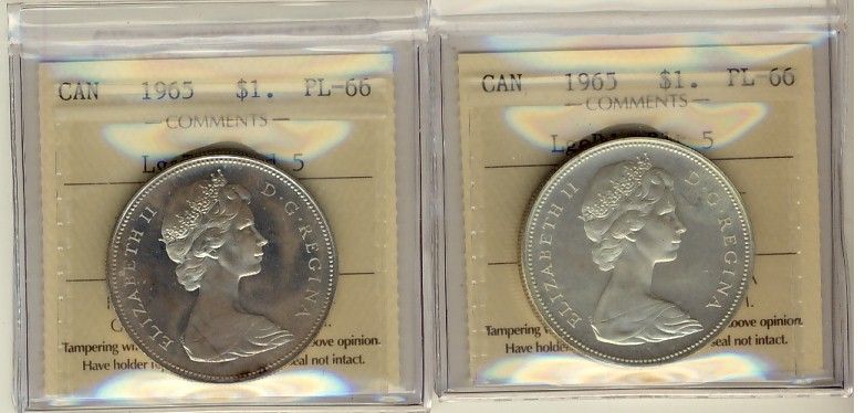 1 Dollar 1965 Large Beads Pointed 5, 1965 Large Beads Blunt 5, both ICCS PL-66. Lot of 2 coins.