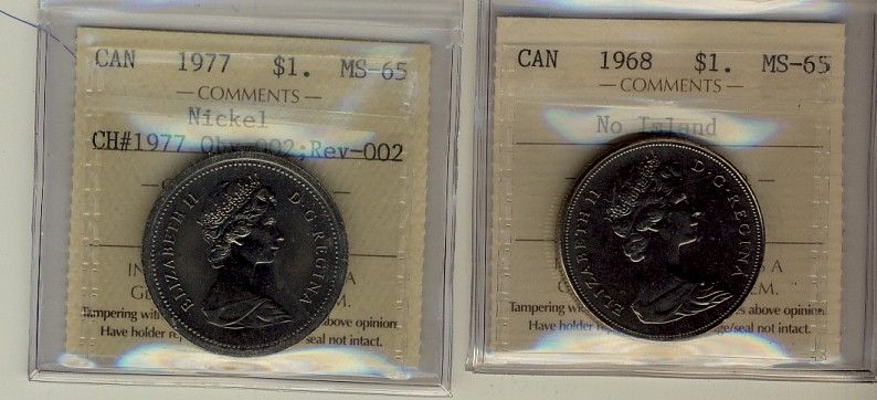 1 Dollar 1968 No Island and 1977 Obverse 2, Reverse 2, both ICCS MS-65. Lot of 2 coins.