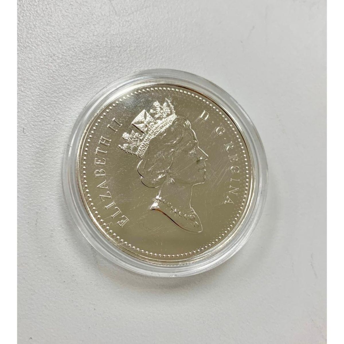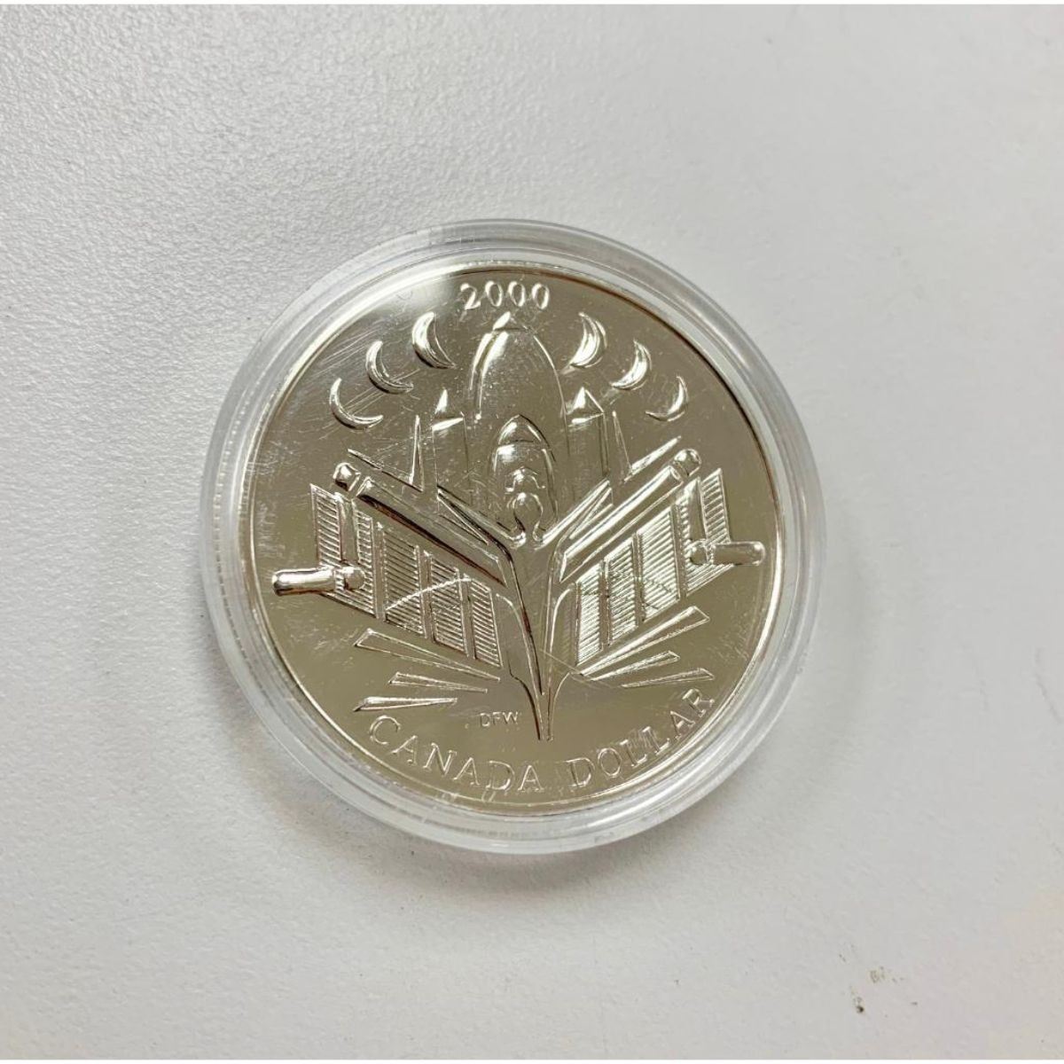 Commemorative issue New Millennium Obverse Bust of Elizabeth II to right Lettering: ELIZABETH II D · G · REGINA Engraver: Dora de Pedery-Hunt Reverse Composition describing Canada's voyage of discovery in the next millennium Lettering: 2000 CANADA DOLLAR Engraver: D. F. Warkentine Edge Reeded Specifications Country: Canada Type: Non-circulating coin Year: 2000 Value: 1 Dollar (1 CAD) Currency: Canadian dollar (1858-date) Composition: Silver (.925) Weight: 25.175 g Diameter: 36.07 mm Thickness: 2.95 mm Shape: Round