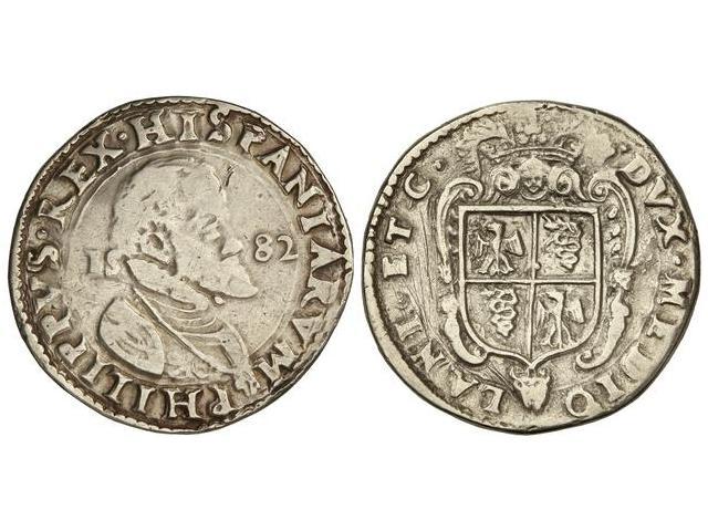 1 Ducatón. 1582. MILÁN. 27 grs. AR. (Rayas en reverso. Limpiada). Vti-52. MBC-.