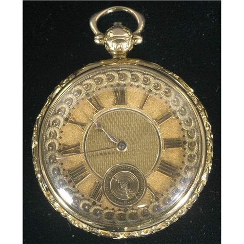 1 ENGLISH 18K GOLD POCKET WATCH key-wind with machine turned chapter ring and sweep seconds 55mm diameter early 19th century PACKING AND SHIPPING (excluding insurance) by Fairfield Auction to points within the Continental U.S.A. (international must be handled by 3rd party shipper) $20. CONDITION REPORT: excellent